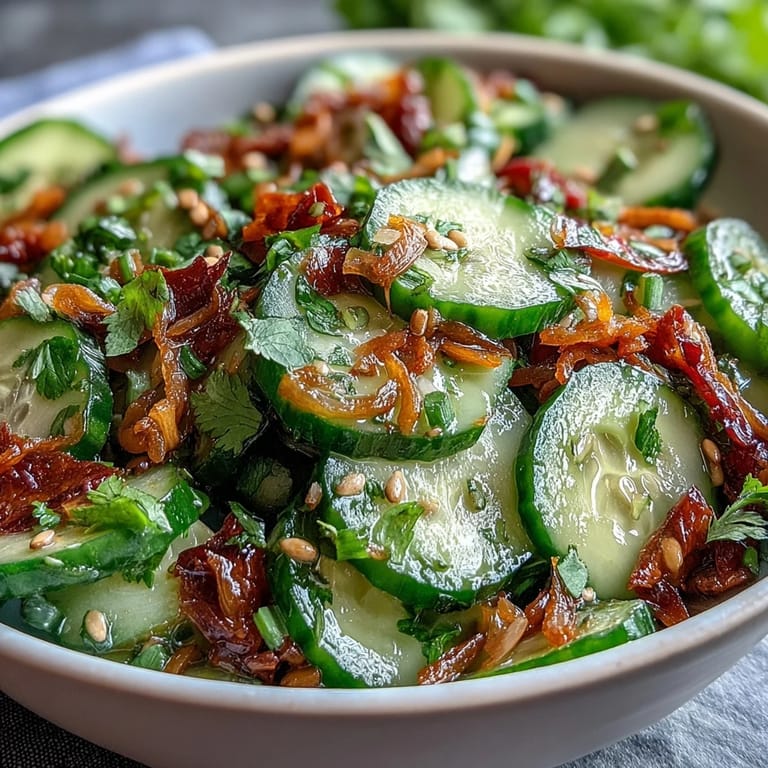 Save There's something about a cucumber salad that stops you mid-afternoon and makes you pause. I discovered this version while leafing through a worn cookbook at a farmer's market, and the simplicity of it—just cucumbers, sesame oil, rice vinegar—felt almost too honest to ignore. What grabbed me was how the ginger and garlic whisper in the background rather than shout, letting the crisp vegetables be the real star. I made it that evening without any real plan, just wanting something cool and alive. It's become the dish I reach for when I need clarity in a bowl.