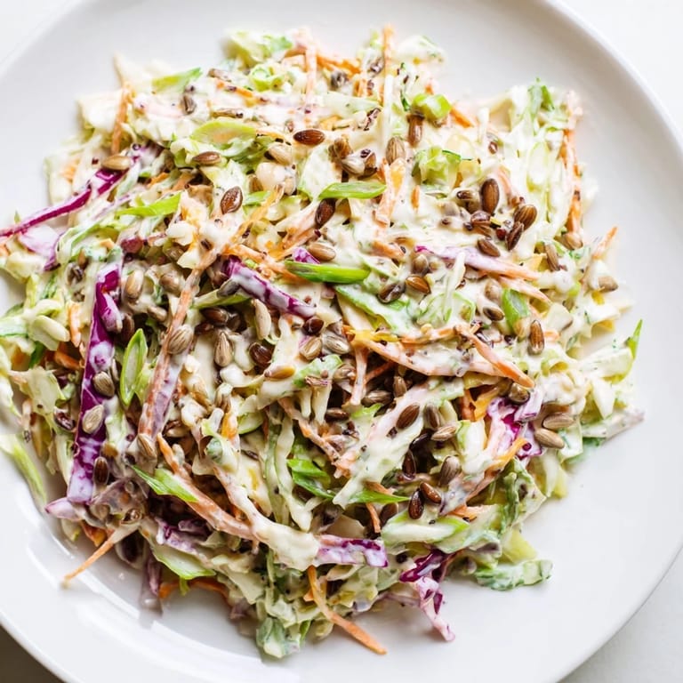 The combination of finely shredded cabbage, grated carrots, and roasted sunflower seeds provides multiple layers of delightful crunch.