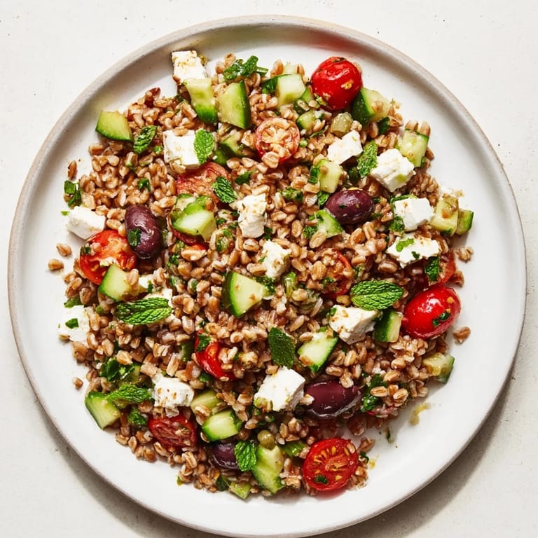 Save My neighbor showed up one Saturday morning with a container of this farro salad, still cold from her fridge. She'd made too much for a potluck and thought I'd like it. I ate it standing at the counter with a fork, straight from the Tupperware, and by noon I was texting her for the recipe. That chewy grain with the salty feta and bright lemon was exactly what I didn't know I needed.