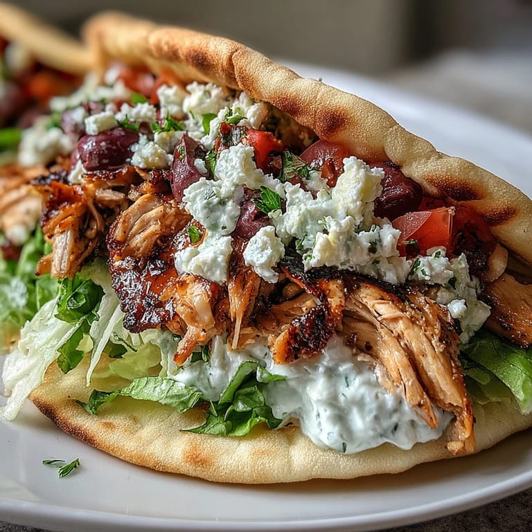 - Lay a warmed pita on a plate, spread a generous spoonful of feta tzatziki down the center, and layer with shredded lettuce, diced tomatoes, red onion slices, and halved Kalamata olives. Pile the sliced chicken on top, drizzle with more tzatziki, and garnish with fresh parsley or mint.