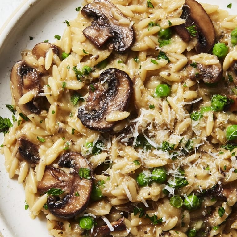 This uses orzo pasta instead of rice. While both rely on gradual broth absorption for creaminess, orzo cooks faster (18-20 minutes versus 25-30) and requires less constant stirring, making it more accessible for home cooks.