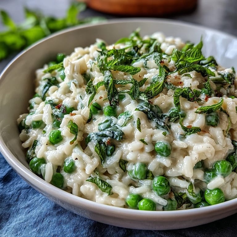 Spring peas have a natural sweetness that deepens when they're cooked gently in a creamy rice base, and they don't need much else to shine. The mint acts like a spotlight, bringing out that sweetness while the lemon zest adds brightness that keeps the whole dish from feeling heavy. It's the kind of cooking that respects what's in season instead of fighting against it.
